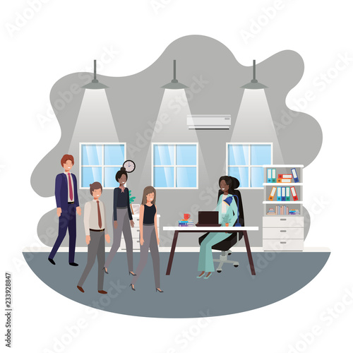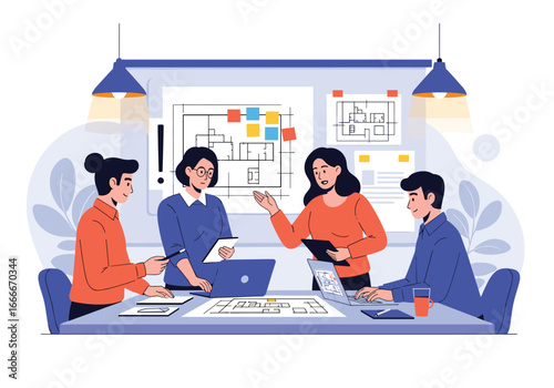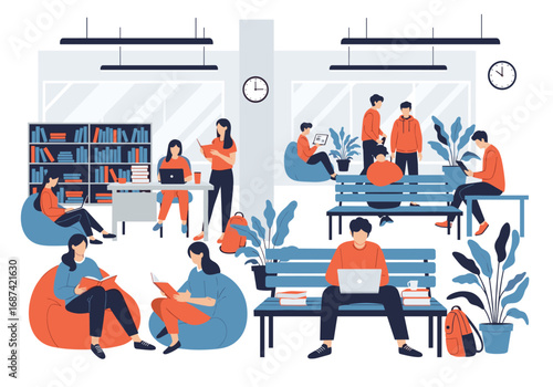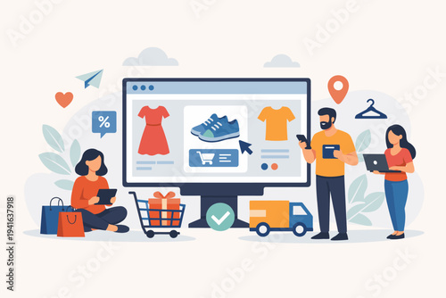 Магазин электроники, векторная плоская иллюстрация. Мужские и женские персонажи продавцы или продавщицы в магазине и покупатели, выбирающие бытовую технику и электронику, такую как стиральная машина, телевизор, домашний кинотеатр.