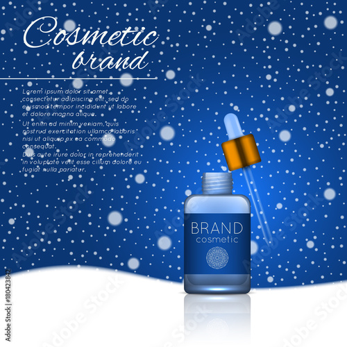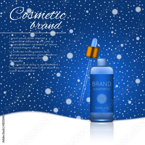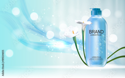 Реклама питьевой воды. Векторная реалистичная иллюстрация большой пластиковой бутылки и стакана чистой воды, пузырьков, кубиков льда, наливания воды. Шаблон рекламного плаката бренда.
