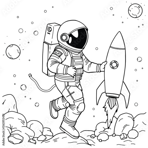 Шаблон векторного плаката для исследования космоса с квантовыми вычислениями. Астронавт подключен к квантовому компьютеру. Иллюстрация дизайна концепции будущего космических путешествий в плоском стиле.