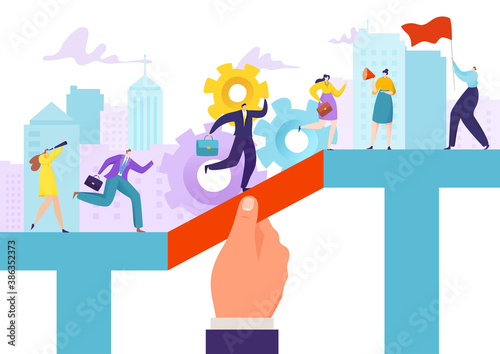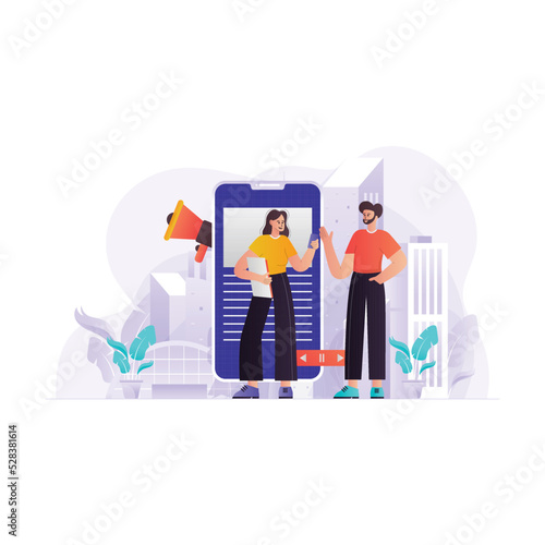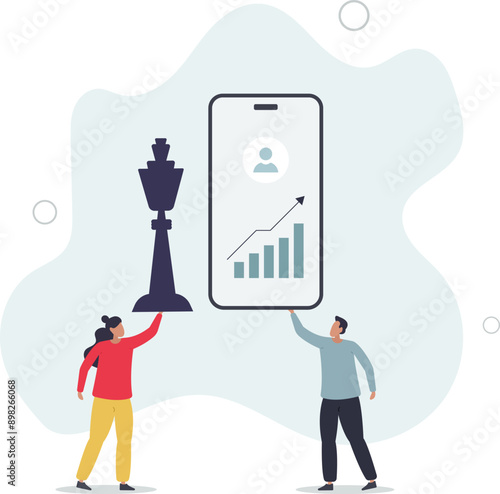 Векторная концептуальная иллюстрация мобильных приключенческих квестовых игр. Огромный смартфон с игровым маршрутом и наградой в самом конце, мужские и женские персонажи с лупой, телескопом. Квестовые мобильные игры.