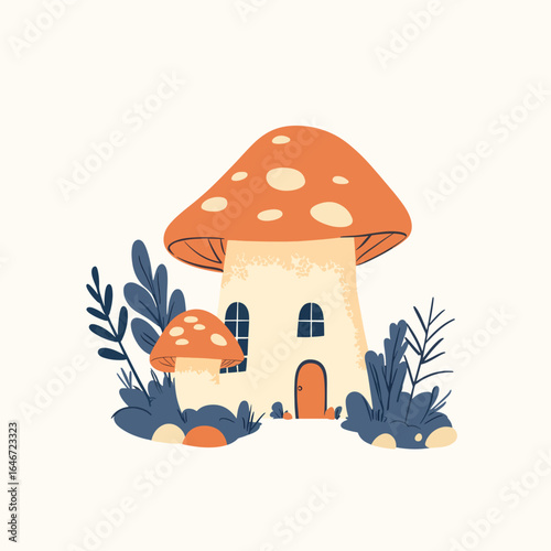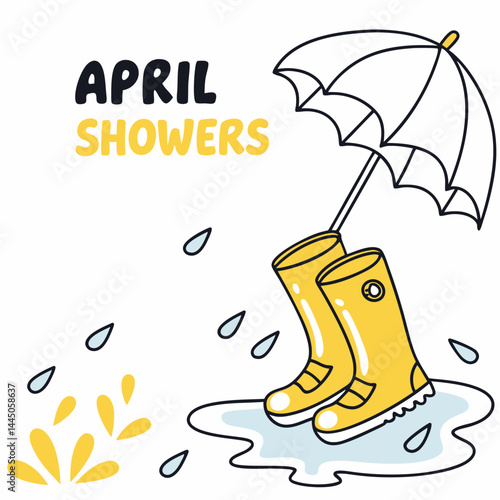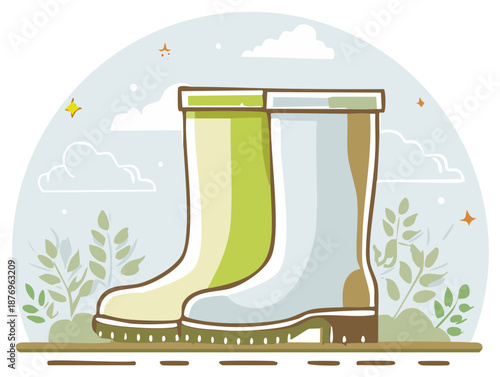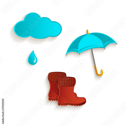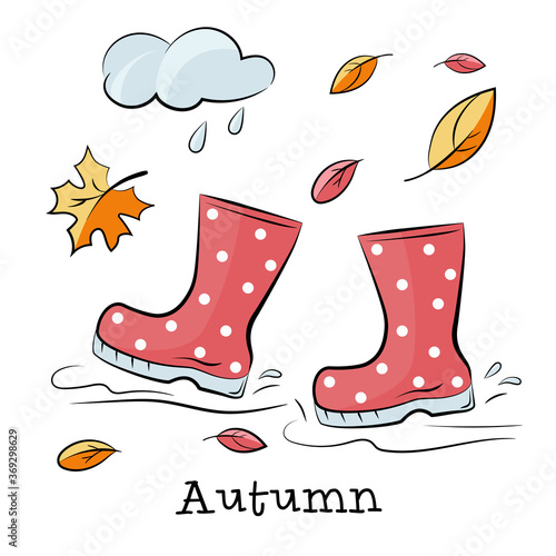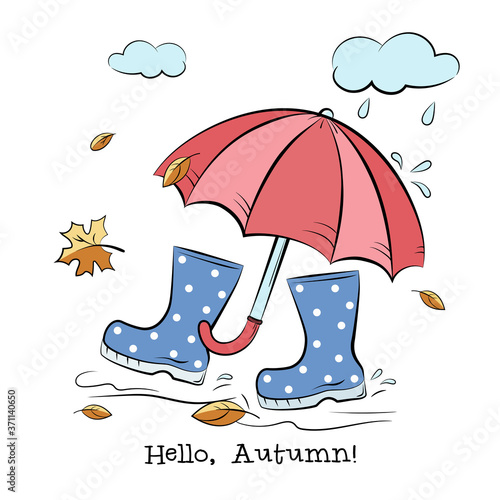Дождливая осенняя векторная иллюстрация дизайна в плоском стиле. Зонтик, резиновые сапоги, облака, тыква, желуди, грибы, листья, чашка чая с лимоном. Осенняя композиция для веб-баннера, страницы сайта и т.д.