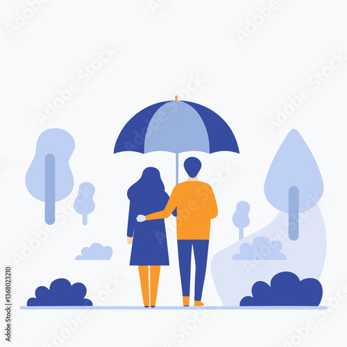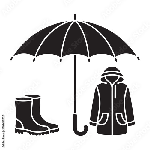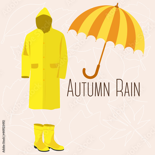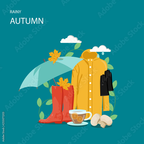 Дождливая осенняя векторная иллюстрация дизайна в плоском стиле. Зонтик, плащ, резиновые сапоги, перчатки, облака, грибы, листья и чашка чая с лимоном. Осенняя композиция для веб-баннера, страницы сайта и т.д.