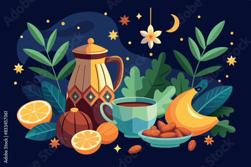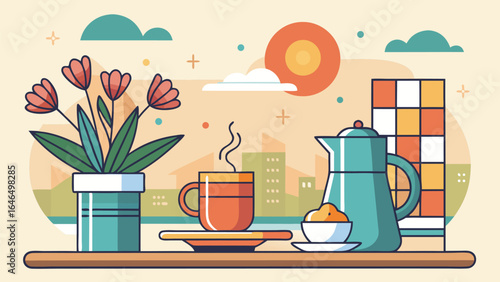 Дождливая осенняя векторная иллюстрация дизайна в плоском стиле. Банка варенья, резиновые сапоги, облака, тыква, желуди, грибы, листья и чашка чая с лимоном. Осенняя композиция для веб-баннера, страницы сайта и т.д.
