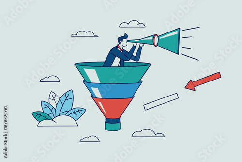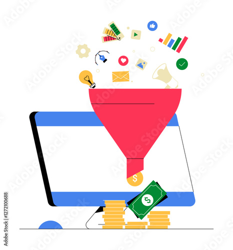 Векторная иллюстрация воронки продаж для оптимизации конверсии. Процесс привлечения клиентов, лиды и советы по монетизации стратегий smm. Концепция цифрового входящего маркетинга
