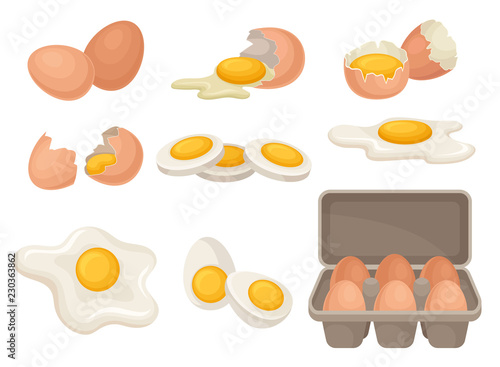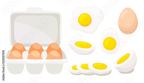 Сырые, сваренные вкрутую, жареные куриные яйца, векторная изолированная иллюстрация. Цельные и разбитые белые и желтые свежие сырые яйца. Желток, белок, яичная скорлупа, макет открытой потребительской картонной упаковки. Птицеводство.