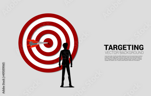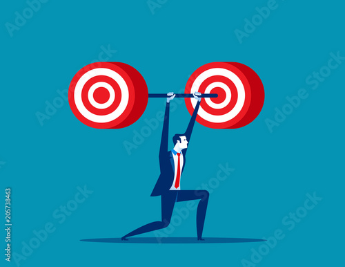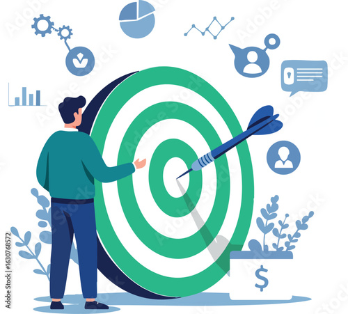 Крошечные персонажи, нацеленные на огромную цель, привлекающие клиентов магнитом, смотрящие в телескоп, плоская векторная иллюстрация. Видение бизнеса, достижение целей. Повышение графика роста бизнеса, успеха.