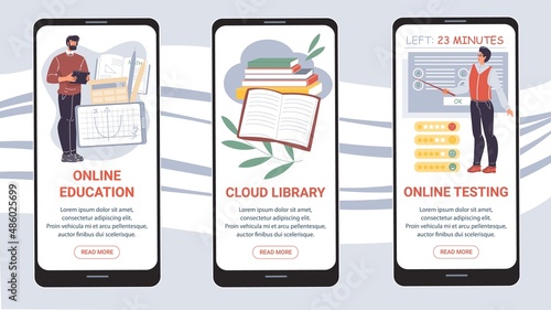 Читающая книга. Библиотека. Знания, образование. Экраны загрузки мобильного приложения. Векторный шаблон баннера для веб-сайта и мобильной разработки. Иллюстрация дизайна веб-сайта и пользовательского интерфейса.