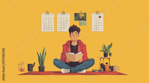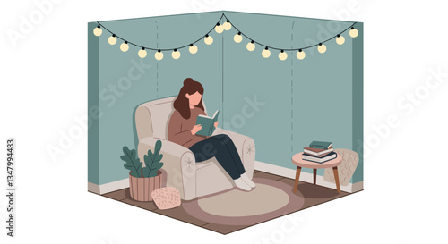 Молодая женщина читает свою любимую интересную книгу, сидя в уютном кресле для отдыха в гостиной дома, векторная плоская иллюстрация. Чтение книг хобби, образование, изучение литературы.