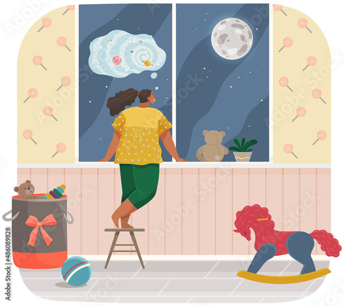 Векторная плоская иллюстрация молодой женщины, читающей книгу о Вселенной, планетах, сидя в кресле в гостиной. Прочитайте и придумайте концепцию веб-баннера, страницы веб-сайта и т.д.