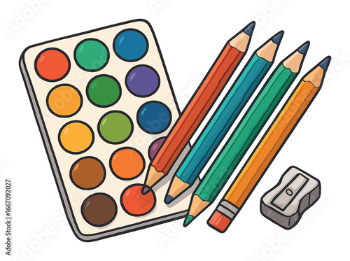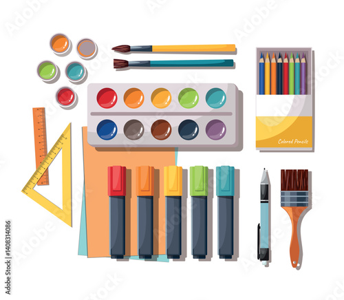 Комбинированный набор для рисования. Реалистичная палитра художника, кисти для рисования, тюбики и баночки с краской, ножи, карандаши, векторная иллюстрация. Художественные инструменты и расходные материалы.