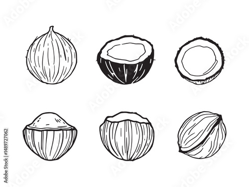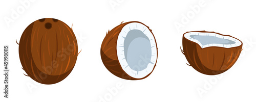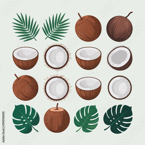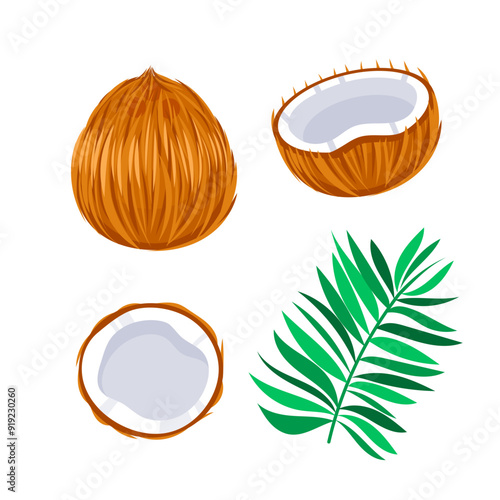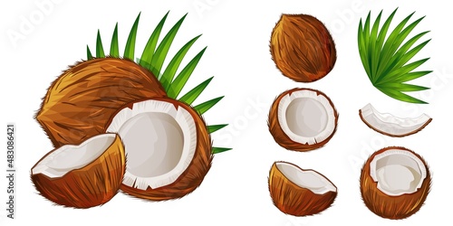 Набор кокосовых фруктов, векторная иллюстрация, изолированная на белом фоне. Реалистичный свежий кокосовый орех целиком, наполовину, кусочками, измельченными хлопьями. Тропическая еда, органический натуральный продукт.