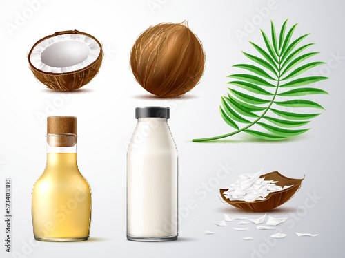 Набор кокосовых фруктов, векторная иллюстрация, изолированная на белом фоне. Реалистичный цельный и половинчатый кокосовый орех, чипсы, молоко, масло, косметика, зеленые листья пальмы. Органический натуральный продукт.