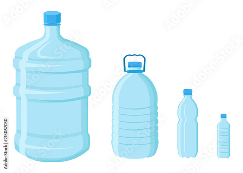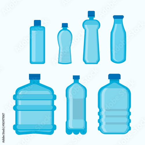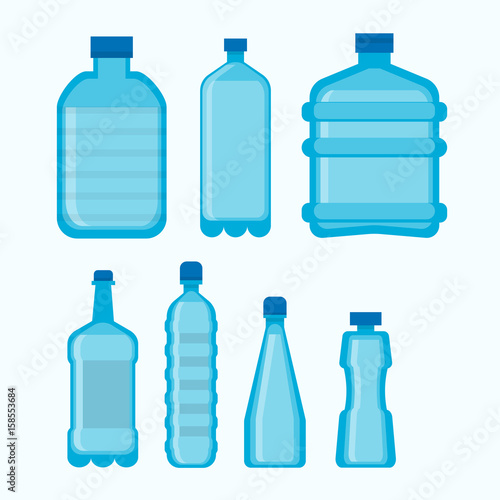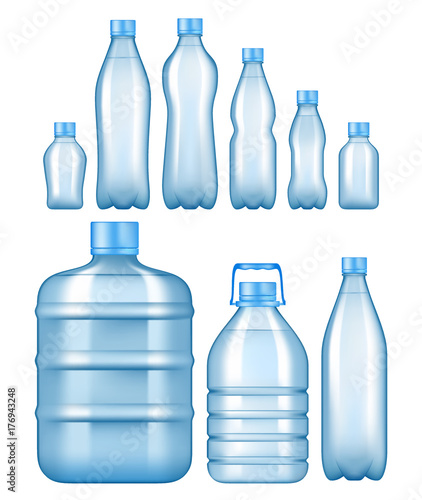 Реалистичные пластиковые бутылки с водой, векторная иллюстрация. Бутылки для упаковки чистой питьевой воды различных размеров и форм для холодильных установок и розничной торговли.