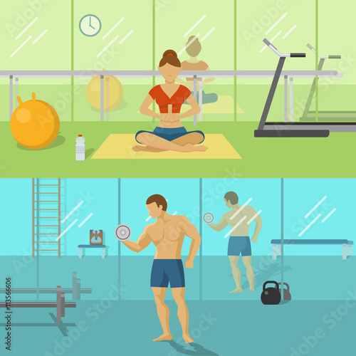 Спортсмены, тренирующиеся на беговой дорожке, с гантелями в медицинском центре или реабилитационном тренажерном зале, векторная плоская иллюстрация. Физиотерапевтическое восстановление после спортивной травмы. Спортивная медицина и восстановление.