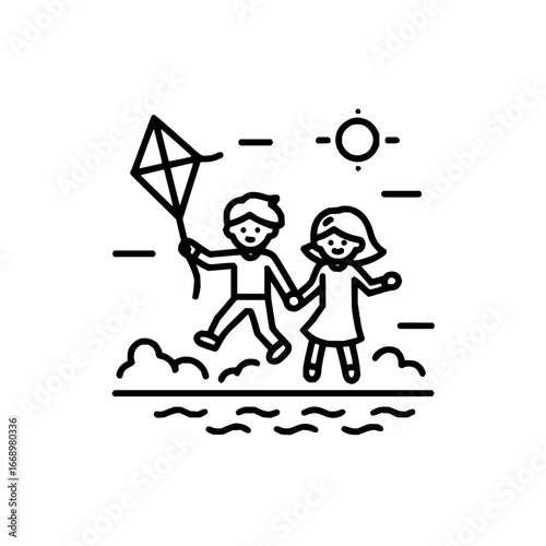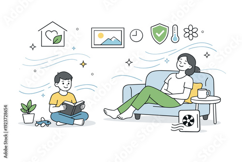 Векторная иллюстрация парка развлечений. Элемент дизайна концепции отдыха с аттракционом "Колесо обозрения", мальчик, сидящий на скамейке и читающий книгу. Мультяшные персонажи, плоский стиль.