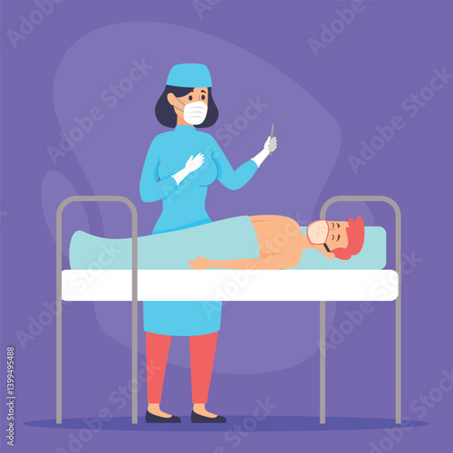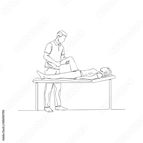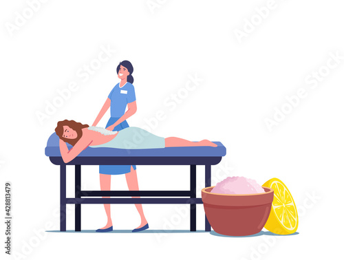 Реабилитационный центр. Массажная терапия, плоская векторная иллюстрация. Женщина-физиотерапевт делает массаж спины пациенту, лежащему на столе. Реабилитация и физиотерапевтическое лечение пострадавших людей