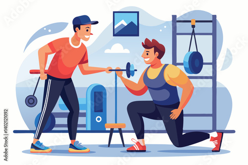 Реабилитационный центр. Пациент учится ходить с помощью параллельных брусьев с помощью физиотерапевта, плоская векторная иллюстрация. Реабилитация, физиотерапевтическое лечение людей с травмами, инвалидностью