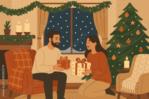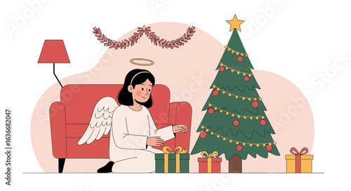 Расслабленная молодая женщина читает, сидя дома в кресле. Украшение домашней гостиной для зимних рождественских праздников