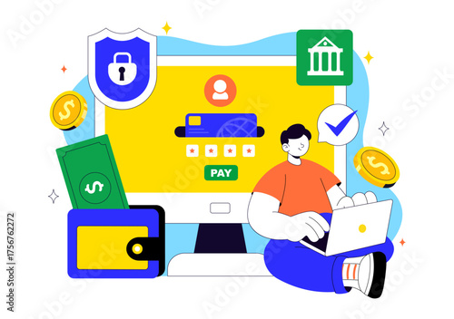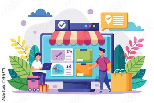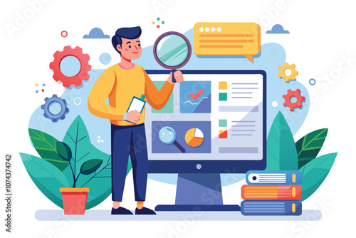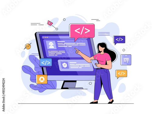 Рабочее место на огромном экране смартфона и молодая девушка с чашкой кофе, векторная плоская иллюстрация. Бизнес-леди-фрилансер, работающая удаленно из дома из-за пандемии коронавируса, карантина. Оставайся дома