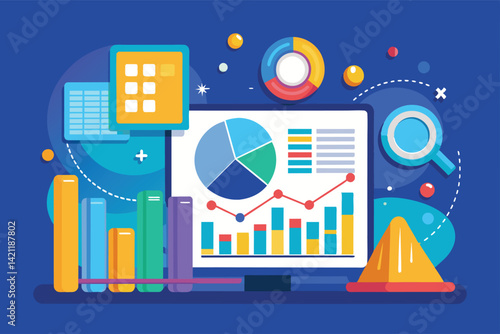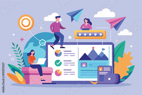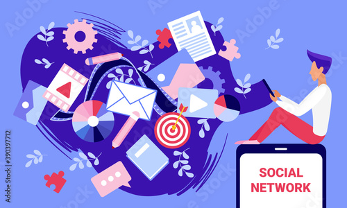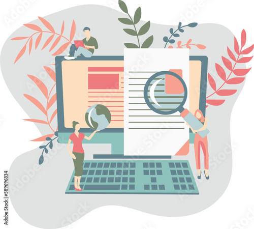 Фрилансер, деловой человек, работающий удаленно из домашнего офиса с помощью портативного компьютера, векторная плоская иллюстрация. Газетный лист, смартфон, чашка кофе, кактусовое растение на столе. Концепция домашнего рабочего пространства.