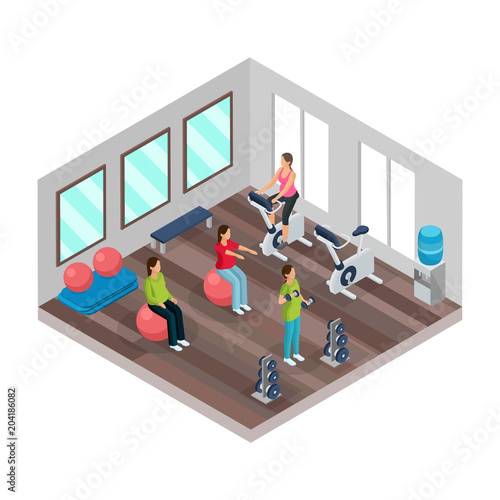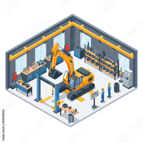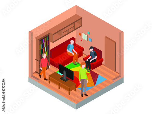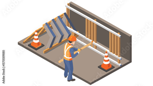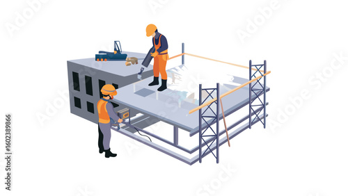 Векторная иллюстрация плоского изометрического разреза ремонтной бригады. Вырезанный интерьер комнат дома с рабочими, красящими стены, устанавливающими ламинат и электрические розетки.
