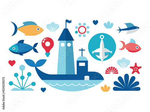 Отдых в Египте векторная иллюстрация дизайна в плоском стиле. Египетские пирамиды, купальник, солнцезащитный крем, бокал коктейля, солнцезащитные очки, экзотические рыбы. Композиция "Путешествие в Египет" для веб-баннера, страницы веб-сайта и т.д.