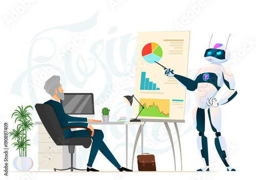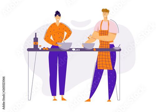 Молодой человек делает комплименты девушке в униформе шеф-повара, стоящей рядом с ресторанным столом, векторная плоская иллюстрация, изолированная на белом фоне. Ресторанный кейтеринговый бизнес.