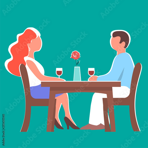 Романтическая пара, сидящая за столиком ресторана и пьющая шампанское, векторная плоская иллюстрация, изолированная на белом фоне. Ресторанный кейтеринговый бизнес.