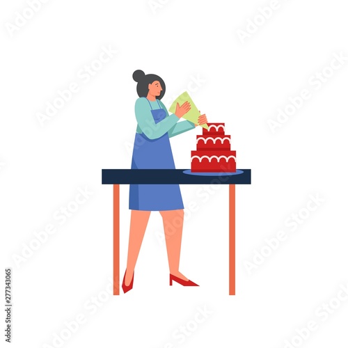 Молодая женщина-кондитер, украшающая большой трехъярусный торт, векторная плоская иллюстрация, изолированная на белом фоне. Повар ресторана, профессиональная концепция приготовления пищи для веб-баннера, страницы веб-сайта и т.д.
