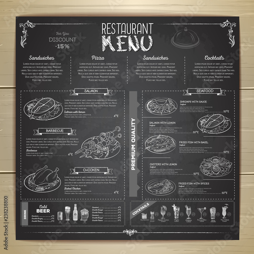 Дизайн меню горячих напитков ресторана на фоне классной доски. Шаблон векторной иллюстрации в винтажном стиле. Нарисованный от руки стиль. Горячий чай, кофе, какао.