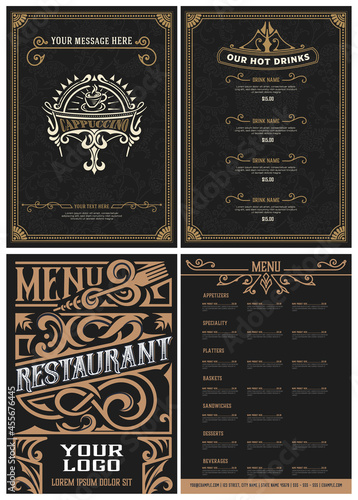 Дизайн меню горячих напитков ресторана на фоне классной доски. Шаблон векторной иллюстрации в винтажном стиле. Нарисованный от руки стиль.