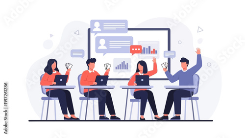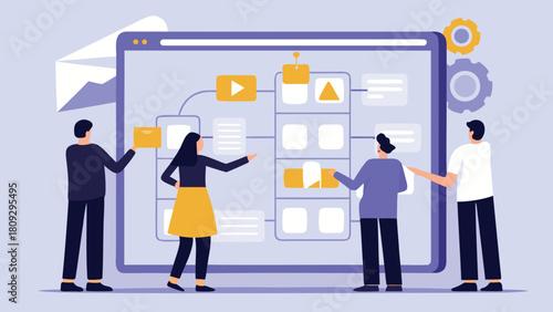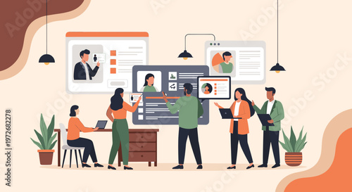 Шеф-повар ресторана повар и официант в униформе, кухонная техника и посуда, векторная плоская иллюстрация. Коммерческая кухня ресторана с мужскими и женскими персонажами, готовящими еду, держащими серебряное блюдо.