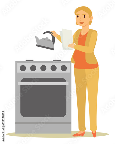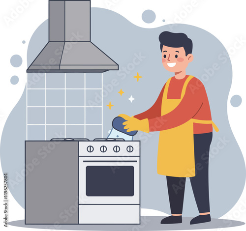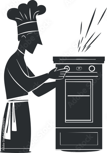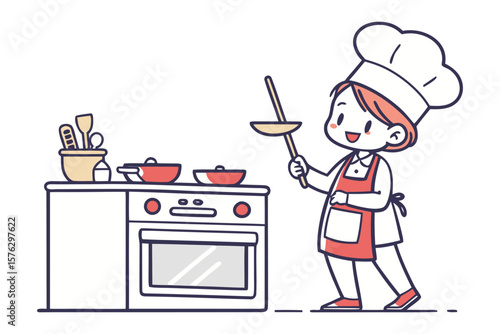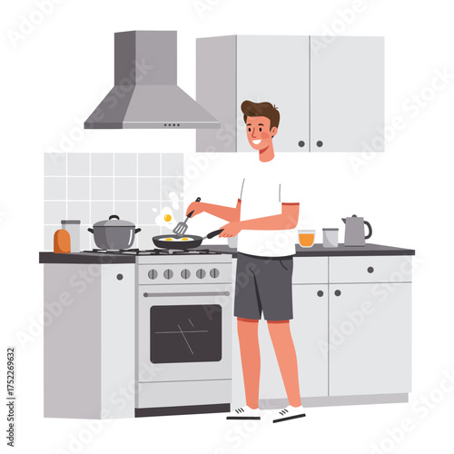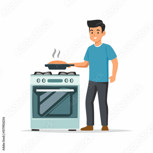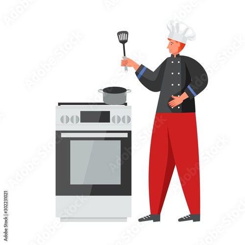 Мужчина-шеф-повар готовит с кухонной лопаткой, готовя вкусную еду, стоя рядом с плитой, векторная плоская иллюстрация, изолированная на белом фоне. Работник ресторана в униформе готовит еду.