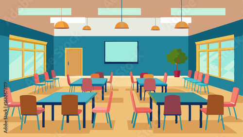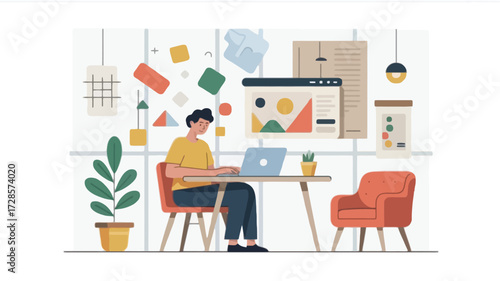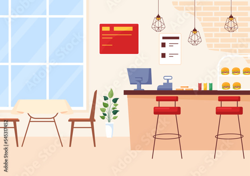 Ресторан быстрого питания, кафе с сидячими местами на открытом воздухе, векторная плоская иллюстрация. Молодой человек покупает еду навынос, две девушки сидят за столиком и пьют кофе. Летняя терраса ресторана, кафетерий на открытом воздухе.