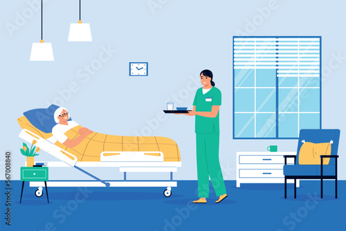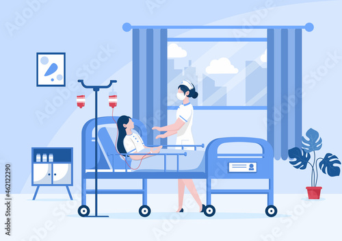 Интерьер реанимационной медицинской палаты с капельницей, аппаратом искусственной вентиляции легких, грустная женщина и пациент на больничной койке, плоская векторная иллюстрация. Отделение интенсивной терапии, больная пожилая женщина в кислородной маске получает внутривенную терапию, вентиляцию легких.