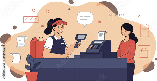 Прилавок розничного магазина. Счастливая женщина делает покупки в модном магазине, плоская векторная иллюстрация. Женщина-кассир, дающая хозяйственную сумку с покупкой девушке, стоящей у кассы и покупающей одежду в бутике
