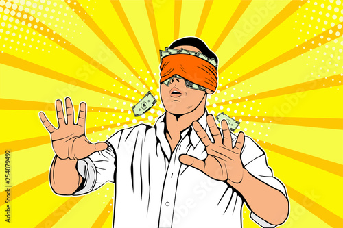 Богатый красивый парень держит деньги и показывает пальцем вверх. Векторная иллюстрация концепции бизнеса и финансов в стиле ретро-комиксов поп-арта.