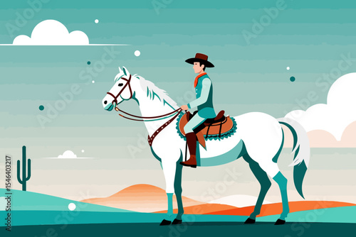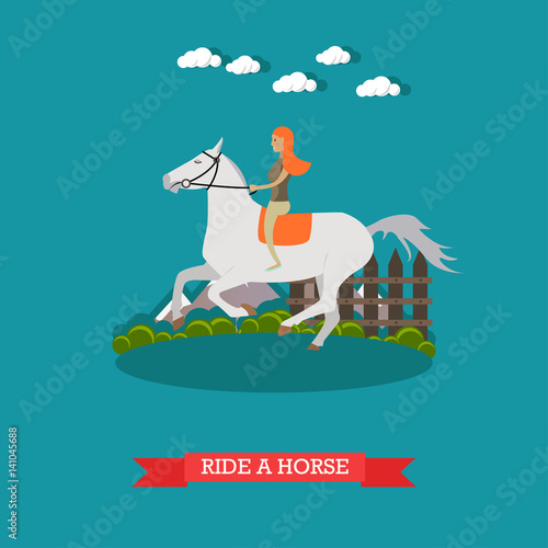 Векторная иллюстрация молодой женщины верхом на белой грациозной лошади. Элемент концептуального дизайна Ride a horse в плоском стиле.