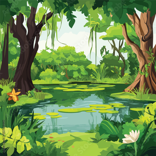 Пейзаж на берегу реки с зеленой травой, деревьями, тростником, растущим в воде. Векторная фоновая иллюстрация летнего сезона с побережьем озера и лесом. Природа на открытом воздухе