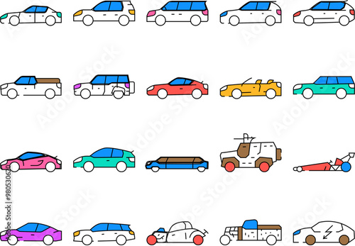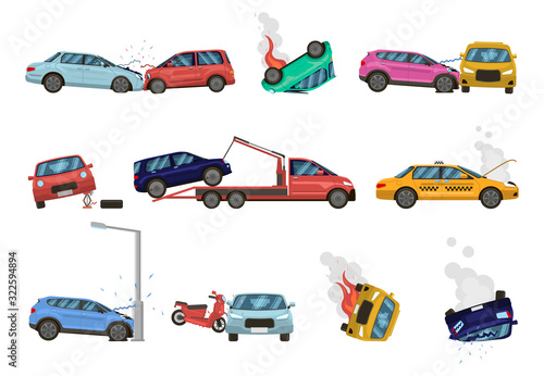 Набор дорожно-транспортных происшествий, векторная плоская изолированная иллюстрация. Столкновение автомобиля с велосипедом, мотоциклом, пешеходом, другой машиной. Автомобильная авария, автокатастрофа, травмированный велосипедист, персонажи-мотоциклисты.