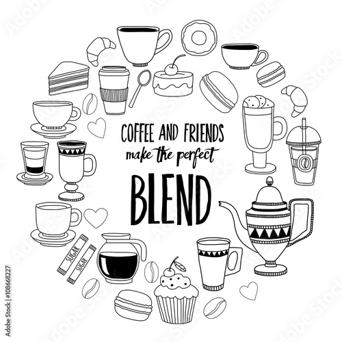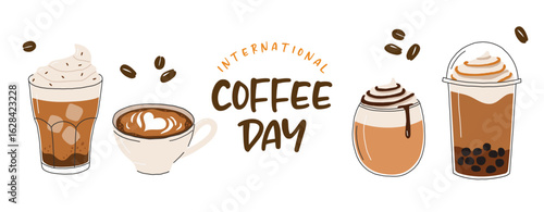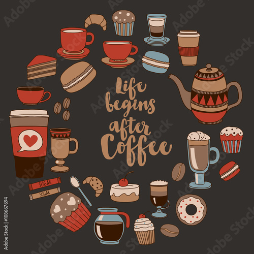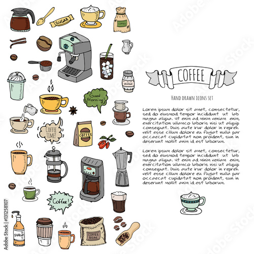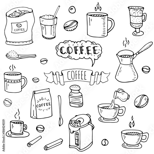 Шаблон баннера рекламного плаката бренда "Жареные кофейные зерна". Векторный реалистичный пакет для упаковки кофе на молнии с винтажными каракулевыми конфетами, кофейными напитками, кофеварками.
