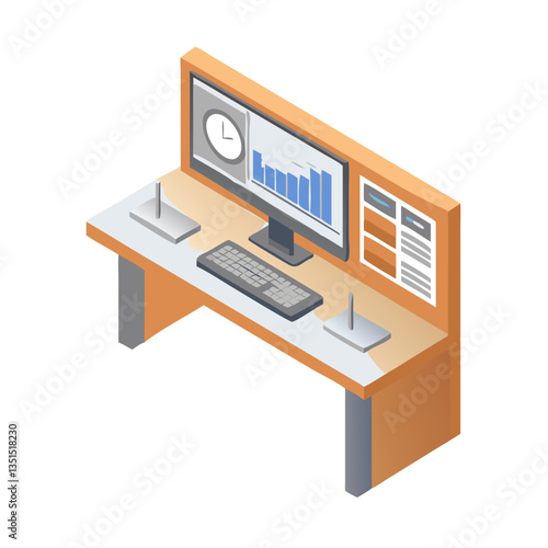 Вектор значков робота-ассистента и машинного обучения. Футуристический робот, работающий со статистикой бизнес-инфографики за столом, выделенным на белом фоне