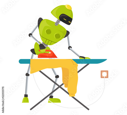 Робот-ассистент, гладящий одежду векторным плоским значком, изолированным на белом фоне. Роботизированная машина с искусственным интеллектом, работающая по дому, иллюстрация выполнения домашней работы. Концепция футуристической технологии искусственного интеллекта