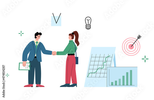 Робот-машина и рукопожатие бизнесмена, плоская векторная иллюстрация. Будущее сотрудничество искусственного интеллекта и человека для достижения общей бизнес-цели.