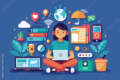 Векторная плоская иллюстрация робототехники. Робот, промышленная роботизированная рука, диаграммы, графики, приборная панель, клавиатура, долларовые монеты, флэш-накопители. Концепция автоматизации бизнес-процессов для веб-баннера, страницы веб-сайта и т.д.