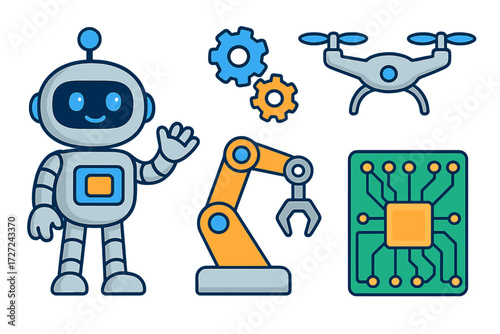 Векторная плоская иллюстрация робототехники. Робот, промышленная роботизированная рука и кисть, диаграммы, графики, джойстик, долларовые монеты. Концепция технологии автоматизации бизнес-процессов для веб-баннера, страницы веб-сайта и т.д.