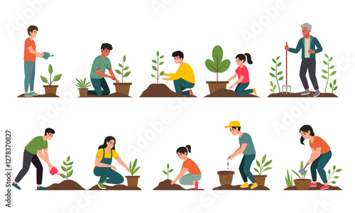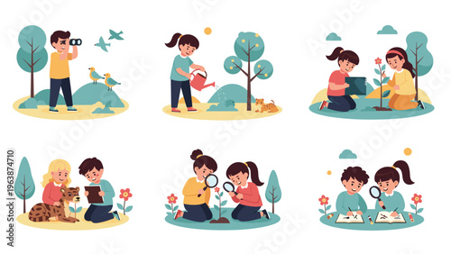 Набор символов школы робототехники, векторная плоская изолированная иллюстрация. Мальчики и девочки-студенты, дети, изучающие робототехнику, строящие роботов, играющие с игрушечными роботами. Школа робототехники.
