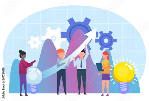 Векторная иллюстрация музыкантов, играющих на гитарах и барабанах на концертной сцене, освещенной прожекторами. Дизайн концертной квартиры рок-группы в плоском стиле.