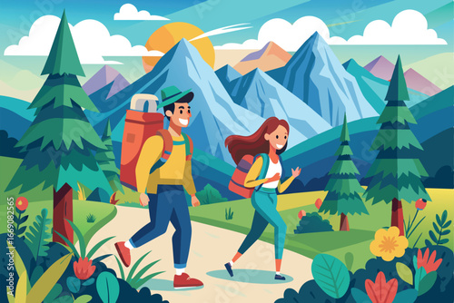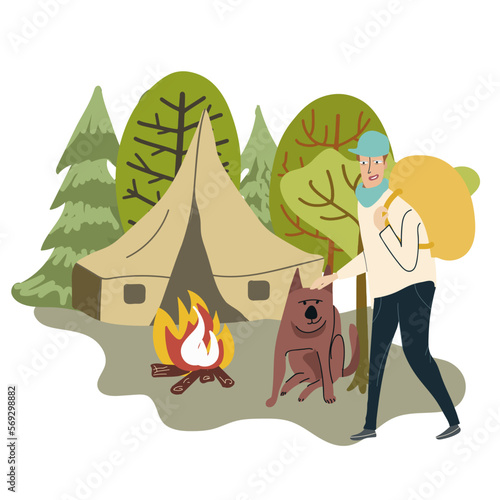 Романтическая пара, сидящая у костра в лесу, плоская векторная иллюстрация. Счастливые туристы, отправляющиеся в поход, пеший туризм, треккинг. Лесной лагерь, пикник, летние развлечения на свежем воздухе.