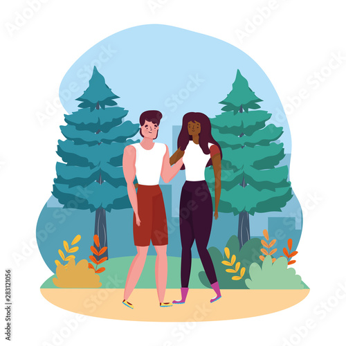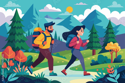 Романтическая пара, сидящая у костра в лесу, плоская векторная иллюстрация. Счастливые туристы, отправляющиеся в походы, пешие прогулки, треккинговые походы. Лесной лагерь, пикник, летние развлечения на свежем воздухе.